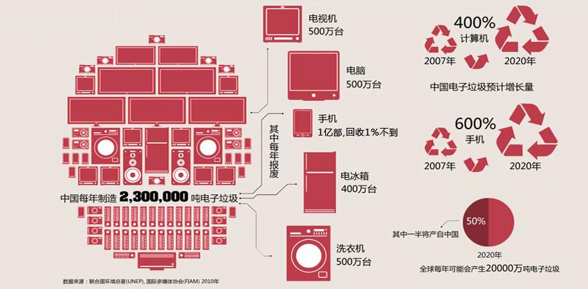 隨著人們更換手機(jī)頻率的加快,越來越多的電子產(chǎn)品被淘汰下來,最后逐漸演變成了電子垃圾,這些電子垃圾產(chǎn)品對(duì)環(huán)境及人類的健康危害極大。據(jù)不完全統(tǒng)計(jì),中國(guó)每年有近3億部廢棄手機(jī),這些廢棄手機(jī)可提煉出4500公斤的黃金。而回收率卻還遠(yuǎn)不到1%。