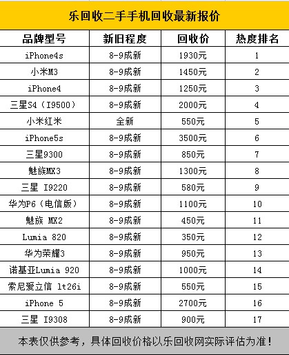 根據(jù)樂回收最新二手手機(jī)回收報(bào)價(jià)顯示,蘋果、三星品牌手機(jī)成年后最熱們回收機(jī)型。在排行榜前17位中,蘋果、三星品牌手機(jī)回收均占據(jù)了四款型號,蘋果iPhone4S和iPhone4代分別成為最熱回收排行棒的第一和第三名。
