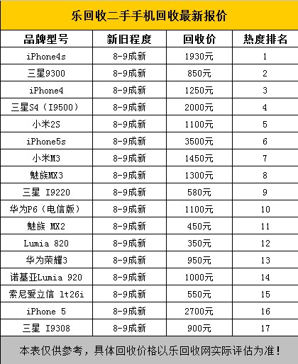 小編在本次排行榜中只保留了前17名熱門回收型號,其余型號及熱門程度可關注樂回收后續(xù)報道。與此同時,由于回收價格隨時都會出現(xiàn)波動,可能部分機型的回收價格存在一定偏差現(xiàn)象,因此本榜單中的回收價格也僅供參考,具體回收價格請以樂回收網在線評估價格為準。