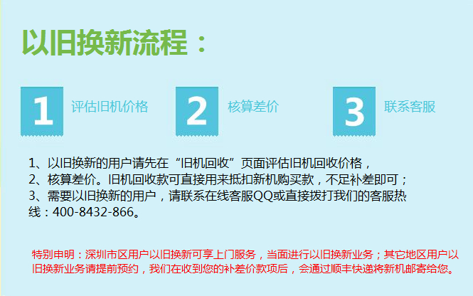 特別申明:深圳市區(qū)用戶以舊換新可享上門服務(wù),當(dāng)面進(jìn)行以舊換新業(yè)務(wù);其它地區(qū)用戶以舊換新業(yè)務(wù)請?zhí)崆邦A(yù)約,我們在收到您的補(bǔ)差價(jià)款項(xiàng)后,會(huì)通過順豐快遞將新機(jī)郵寄給您。